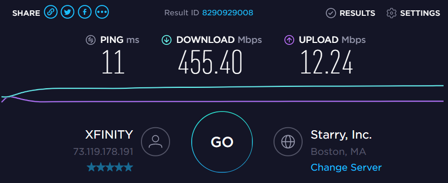 For the second test, I moved closer to the primary router and repeated the tests while being 10 ft a way. While being connected to Synology RT2600AC the download speed reached 455.40Mbps and ESR530 reached a maximum download speed of 240.38 Mbps.