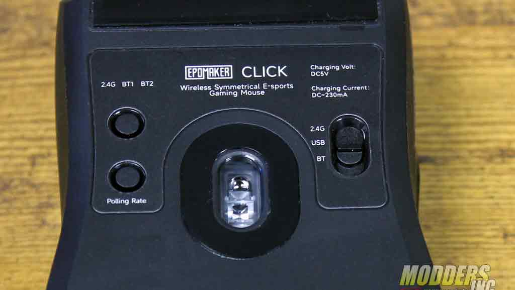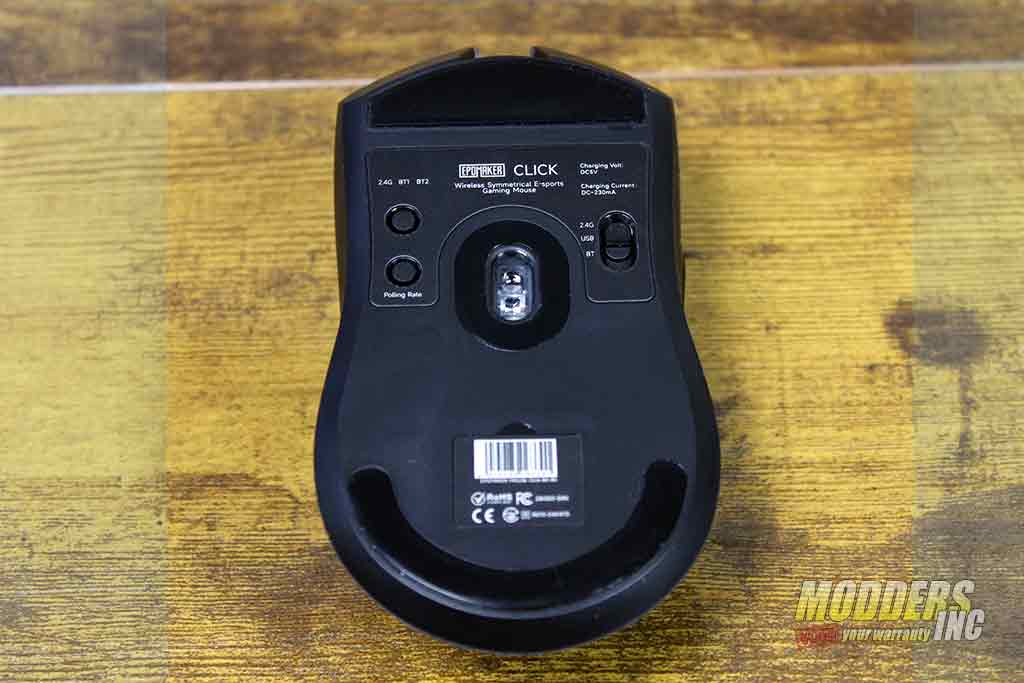 On the underside of the Epomaker CLICK mouse are the action buttons. Starting on the left side of the view, the top button is used to connect the mouse to either 2.4G or Bluetooth. You get visual feedback from a super tiny LED if the process worked or not. The button below it is the one that can change the sensor polling rate. Moving over to the right side, there is a mode selector switch with 2.4G first, USB second, and Bluetooth 3rd.