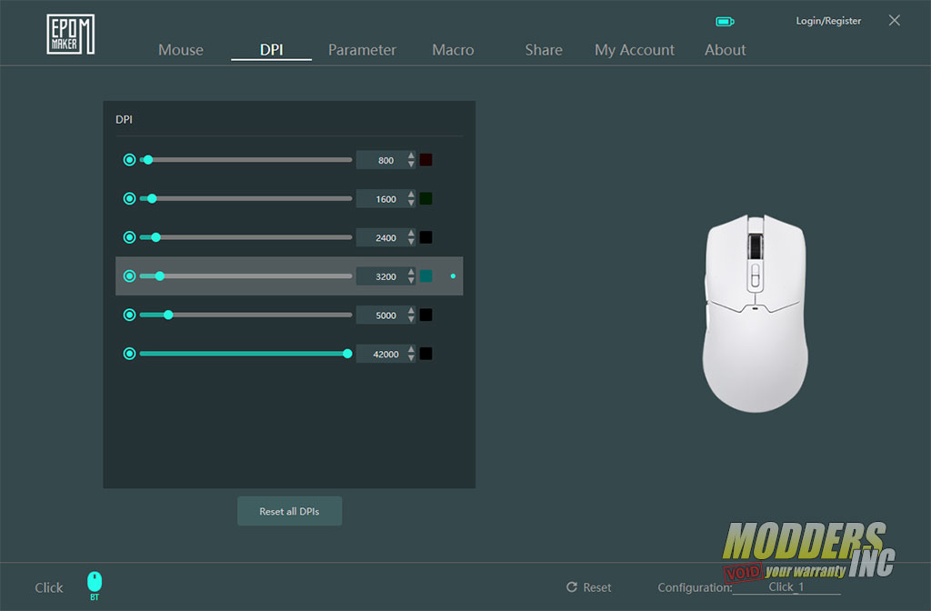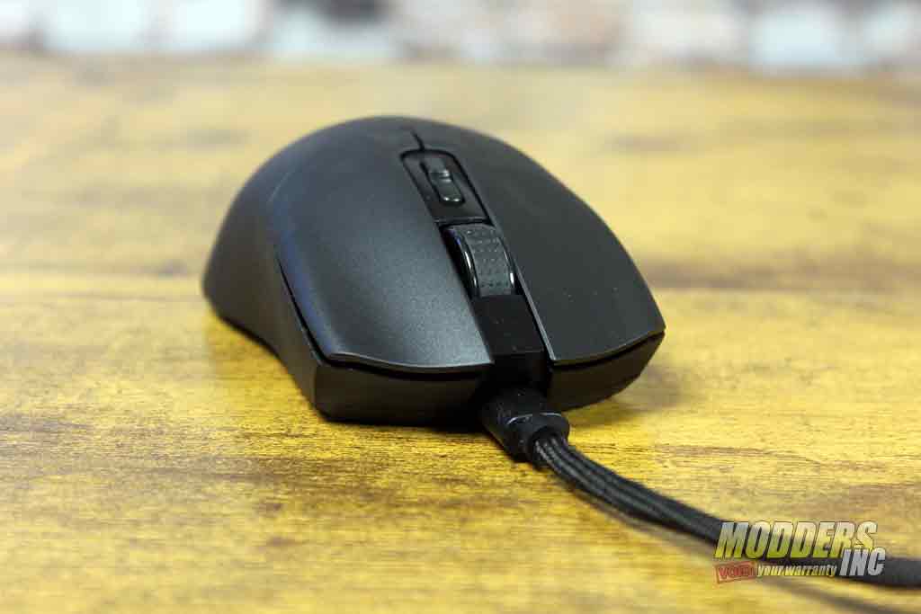 On the working end of the EP{OMAKER CLICK Mouse we have everything we need to make it through the day and night. The switches are optical, which means zero debounce delay and a crisp, clean click. They’re not overly heavy, not overly light — just a nice middle ground. The left and right buttons are 25mm/1 inch wide and about 60mm/2.5 inches long with a slight concave to them all the way down to the finger tip area. In between the two switches rest the scroll wheel and the DPI adjustment buttons (one for lower, one for higher). There are six different levels of DPI that you can set in the software, and each level is color-coded, and that color is projected out through an RGB LED at the crest of the mouse, just where the buttons start. The scroll wheel is about 8mm wide with a textured rubber inlay. The rolling clicks on the wheel are distinctive without being too abrupt, while the pushing down motion is, I would guess, about 2 times the force it takes to click the two main buttons. I mean, it’s not bad or anything, it’s not like you are trying to press down on the brake pedal of a truck from the 50’s.