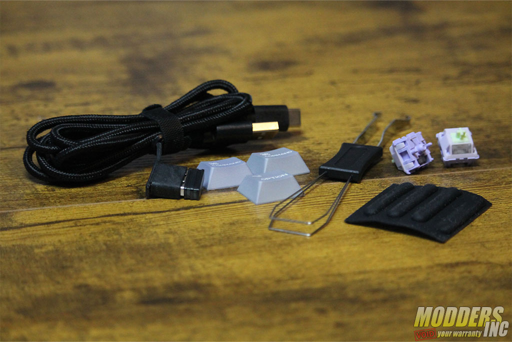 The box within the box contains extra rubber replacement pads, keycaps (2-Command, 1-Options) to make it easier for Mac users. Next, there is a keycap and switch puller in case you need to do some maintenance, and finally, we see the Type-C cable, which is about five feet long, with the 2.4 G adapter attached.