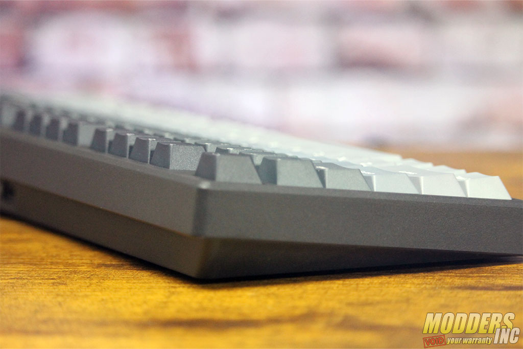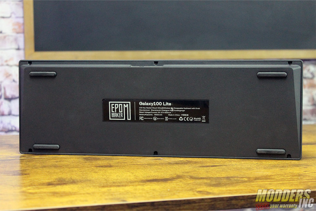 The base of the Galaxy100 Lite is, well, flat. Four large rubber pads are used to keep the keyboard from moving around, and they do a great job. I tried my hardest to push the keyboard around and off my desk. I actually moved my desk and not the keyboard.