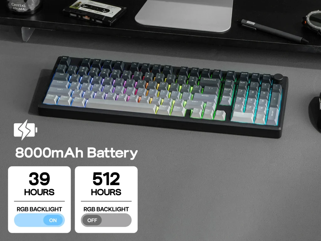 The 8000 mAh battery provides enough power to enjoy the RGB while using the keyboard wirelessly for about 6 days at 6 hours of use per day. The Galaxy100 Lite powers down after a few moments when not in use in either the Bluetooth or 2.4G modes. This helps with the prolonged usage and the enjoyment of being wireless and of the RGB lighting effects.
