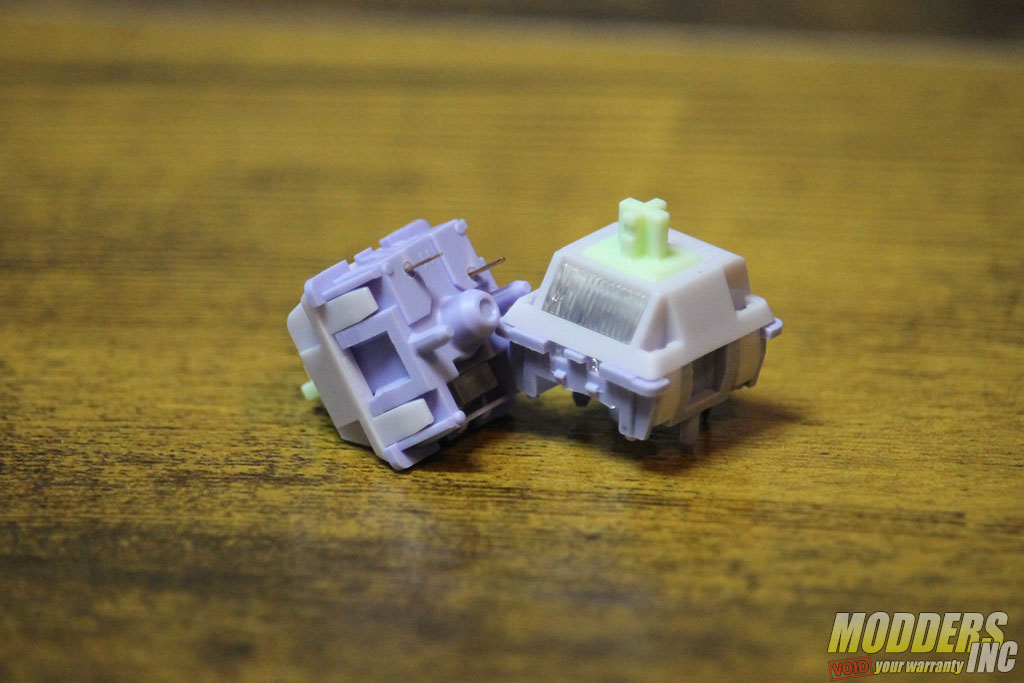 Each key on the keyboard is equipped with a south-facing (forward-facing) LED, which shines brightly, but not overpoweringly, from the typist’s perspective. If you look closely at the switch on the right, you will see a window through which the LEDS project.