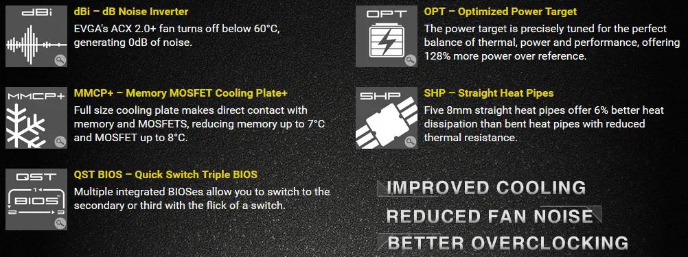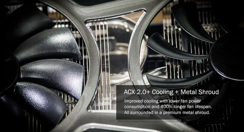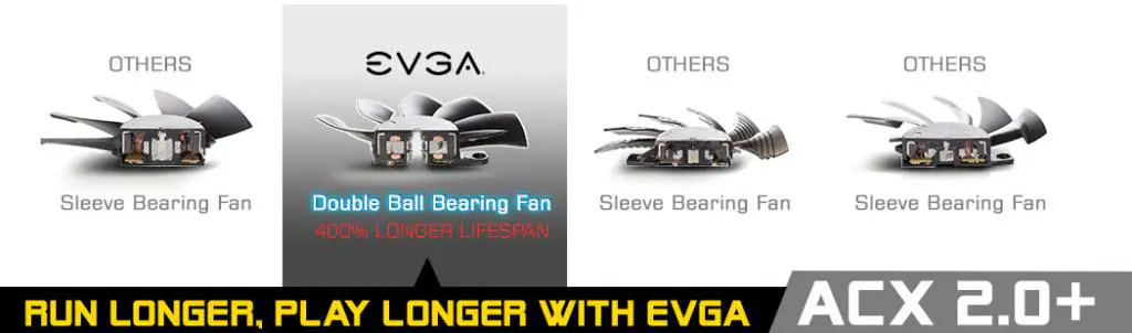 EVGA ACX 2.0+ fans use double ball bearings, which offer 400% longer lifespan than the sleeve bearing fans used by competitors. The oil that is used in Sleeve bearing fans makes them vulnerable and prone to failure after time when the oil dries up. Upgrade to EVGA ACX 2.0+ and your card will go the distance!