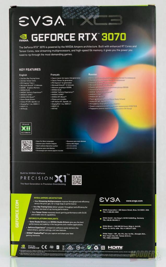 EVGA uses the standard Black and green color theme for the RTX 3070 XC3. On the front of the box, you’ll find a nice graphic representative of the GPU inside. The back of the box details the specifications and features of the GPU as well as giving a bit of information on the Ampere architecture and the GeForce platform.