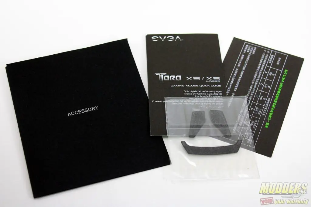 The contents inside consists of the Torq X5 mouse itself with the braided USB cable tied up neatly via an integrated velcro strap as well as an envelope of accessories that includes the user’s guide and replacement set of PTFE feet. The EVGA Torq X5 can be used straight out of the packaging once plugged-in but additional functions are accessible via the EVGA Unleash software, available for download at the Torq X5/X3 product page: http://www.evga.com/mice/TORQ-X5-X3/