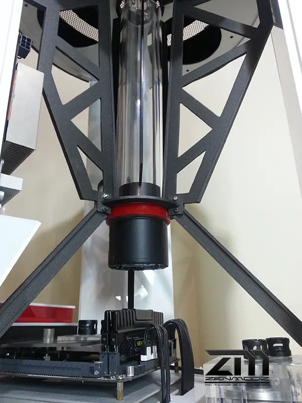 The Power Cell has 3 x 120 slim EK rads in the top part of the case, Each rad has 2 fans fitted to it in a push pull taking air from the inside of the case blowing it out the top. The cool air is pulled in from the bottom vents at the base of the case, That air enters the case from under the back of MoBo cooling it as well.