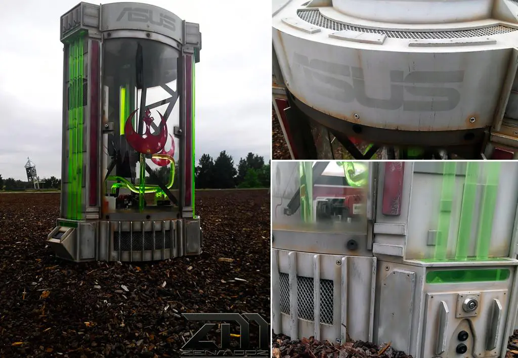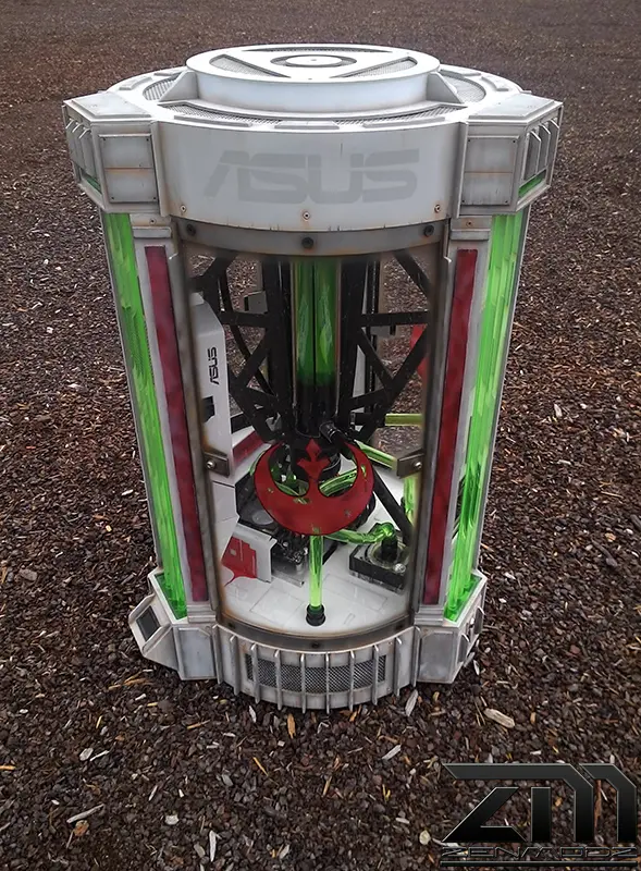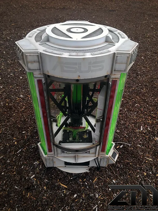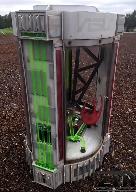 Ken “Zenator” Byrnes is new to case modding but his work shows some impressive creative choices as observed on his Star Wars Power Cell Station scratch-build mod. Believe it or not, this is Ken’s only second casemod, his first being a Fallout 4 tower-mod featured on one of our previous podcast episodes. He is entering both builds in Cooler Master’s Case Mod World Series 2016, one per category under tower and scratch-built. The Power Cell case is a cylindrical tower using a mini-ITX motherboard, a floating reservoir and vertically mounted video card.