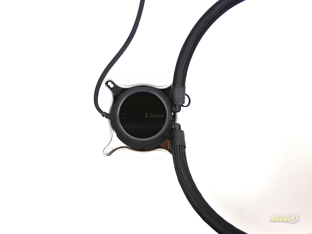 On the top of the CPU pump is a glass faceplate which allows some ARGB light trough. The pump is also equipped with a rotary switch where you can select a full AUTO or PWM operation. Once the pump is on you should be able to see the mode denomination and Fractal logo.