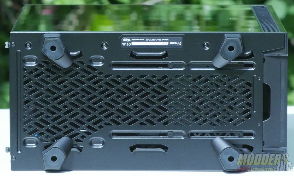 The bottom of the case is covered by a full-length plastic dust filter that uses an ‘X’ shaped bracing pattern for added visual interest. Under the filter is a large area of ventilation that uses the same geometric motif as the top and rear panels. Also exposed by removing the filter is the pull handle for the front panel of the case and a set of rails for mounting either a 120 mm fan or a front-drive cage. The case stands on a set of tall feet that extend over the dust filter and raise the case significantly to provide the power supply with adequate ventilation.