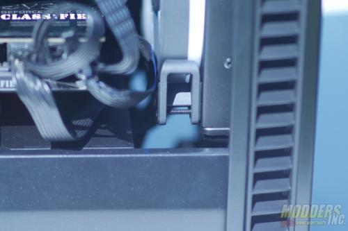 The rear panel of the case is fairly standard but still has a few notable features. The ventilation in the panel features the same geometric motif as the alternate top panel, as do the expansion slot covers. Unlike most cases, there are no crossbars between the expansion slots. This was done to allow users to install aftermarket vertical GPU mounts without having to modify the case. The rear panel also features a removable power supply bracket, a feature that is still rare, even among higher-end cases. At the top of the case, we can also see two plastic tabs that are used to open the side panels.
