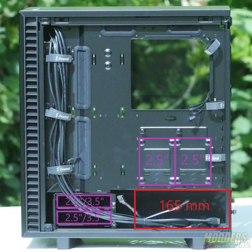 In the back of the case, you can fit two 2.5″ drives behind the motherboard tray and two 2.5″ or 3.5″ drives in the drive cage. With the drive cage installed, Fractal recommends that your power supply not exceed 165 mm (6.50″).