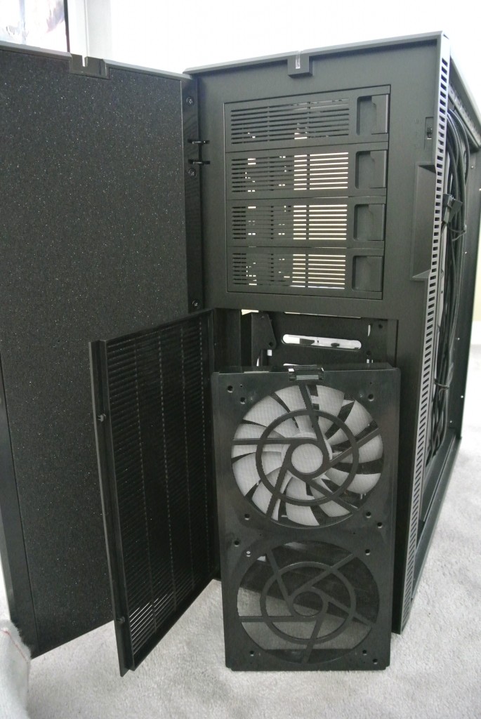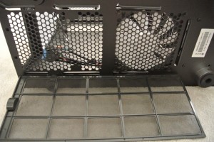 The Define XL R2 is equipped with two dust filters at the air intakes to prevent the dust from entering the case. To clean the PSU dust filter, simply slide the filter toward the area of the case and remove it. To clean the front filter, open the door panel and push the symbols on the hatch to open the fan door. Then just pull down the lever on the top of the filter. Very simple removable compared to some other cases out there where you have to take off panels and unscrew parts of the case to get at the dust filters.