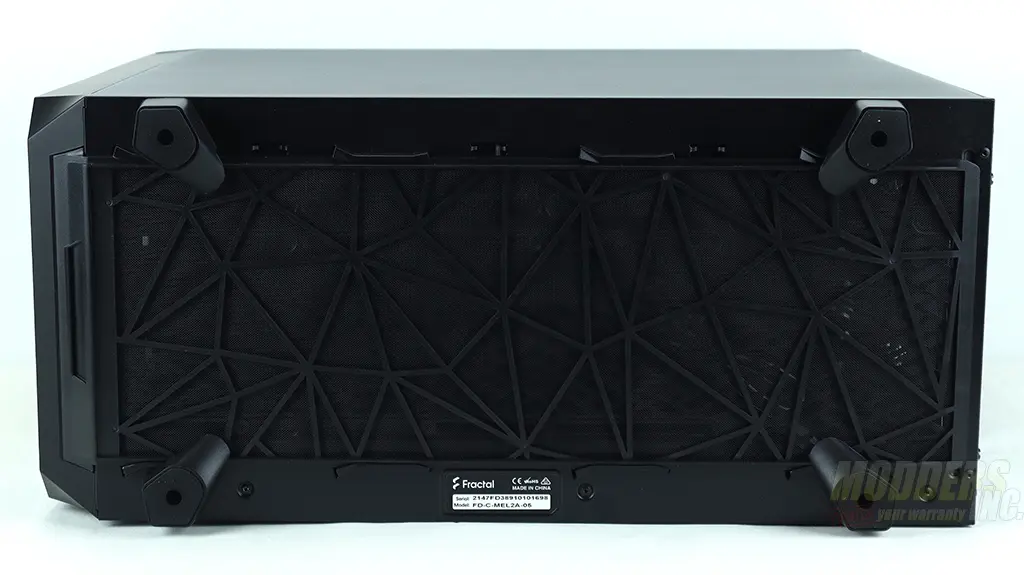 The sharp, textured front bezel insert is made from rolled steel sheet and then it was painted black. I would love to see how they make this pattern out of the regular sheet. On the back of the case, the PSU placement is on the bottom of the case. The Meshify 2 Lite also offers up to seven PCI slots and no vertical GPU support.