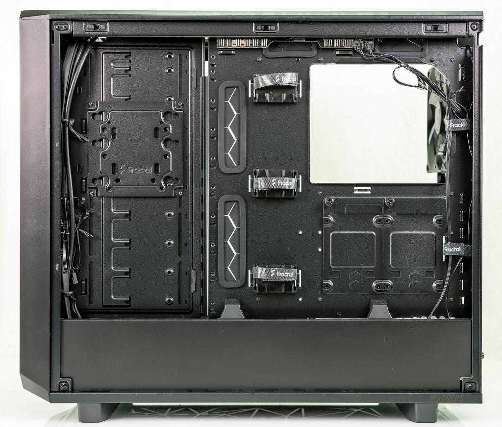 The backside of the case provides plenty of space to route cables and mount drives. Fractal has proved 5 spots where Velcro cable ties are available as well as plenty of zip tie spots. In the basement, there is a cover to help hide cables from the power supply and accessories.