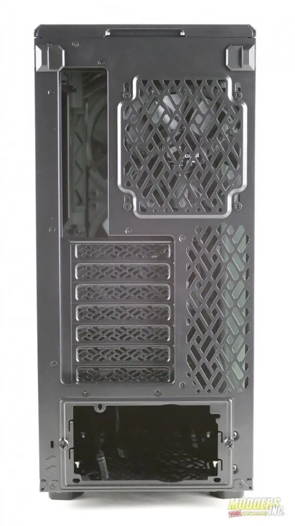 The front bezel of the case is partially made from ABS plastic with steel mesh. On the front of the case, there is a small case badge with a Fractal logo on it. This badge appears to be made from brushed aluminum. The rear of the case has the same standard design with the power supply being on the bottom of the case and the motherboard on the top. There are seven PCI slots in this case and there is no way to vertically mount a GPU without modding the case. The power supply space has a removable PSU plate for easy installations.
