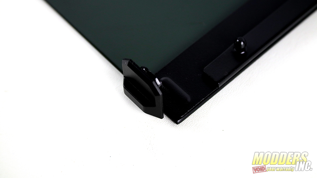 The tempered glass panel is reinforced with a steel frame on the top and bottom. Both panels feature the same type of tool-less latching system and are extremely easy to use. The paint that is applied to the workable mechanism has extra clear coating layers on top. This should help the paint from peeling on the latching mechanism.