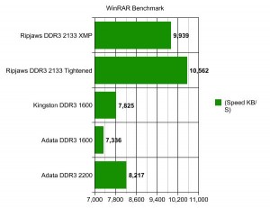 This time the Ripjaws XMP profile performed on par with the Kingston DDR3 1600 and the Adata DDR3 2200 memory, but the tightened timings benchmarks blew everything out of the water here. Now lets look at a real world benchmark.