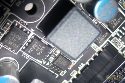 Input power goes through four 270uF input capacitors before 12V power is fed to the Renesas RJK0393DPA low side and RJK03B7DPA WPAK high-side MOSFETs (a total of 10 pairs). For the PWM controller, Gigabyte has moved on to using a fully digital International Rectifier IR3564B on the Revision 4.0, upgraded from the analog Intersil ISL6329 PWM controller of the Revision 3.0. This IR3564B is a 4+1 phase controller, fully supporting AMD SVI1 and SVI2 as well as Intel VR12 and VR12.5 specifications so you might see these in Intel motherboards as well. To get the 8+2 design, Gigabyte uses five IR3598 dual-MOSFET drivers configured as an interleaved doubler to drive the two pairs of Renesas WPAK MOSFETs flanking it. Ten 0.68uH inductors together with 14 560uF solid capacitors make up the output filter.