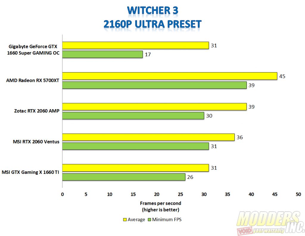 Since its launch in 2015, the Witcher 3 has been a very demanding game. Our the Gigabyte 1660 Super managed to average 60 frames per second in 1080p. In 1440p, the Gigabyte 1660 Super averaged 52 frames per second. The Witcher 3 remained playable in 4k with an average of 31 frames per second.