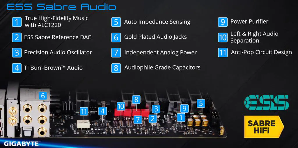 It is not just all about aesthetics, as GIGABYTE also outfits the two highest-end AORUS X299 motherboards with exemplary audio. It is the most ambitious Gigabyte Amp-up on-board audio design yet. This is a bit of an upgrade even compared to just the new Realtek ALC1220. While the X299 Gaming 7 and X299 Gaming 9 use a Realtek ALC1220, the rest of the circuit is upgraded. It comes with an ESS SABRE DAC chip, TI Burr-Brown OpAmps, audio grade capacitors. This gives the board support for up to 32-bit, 384kHz playback.