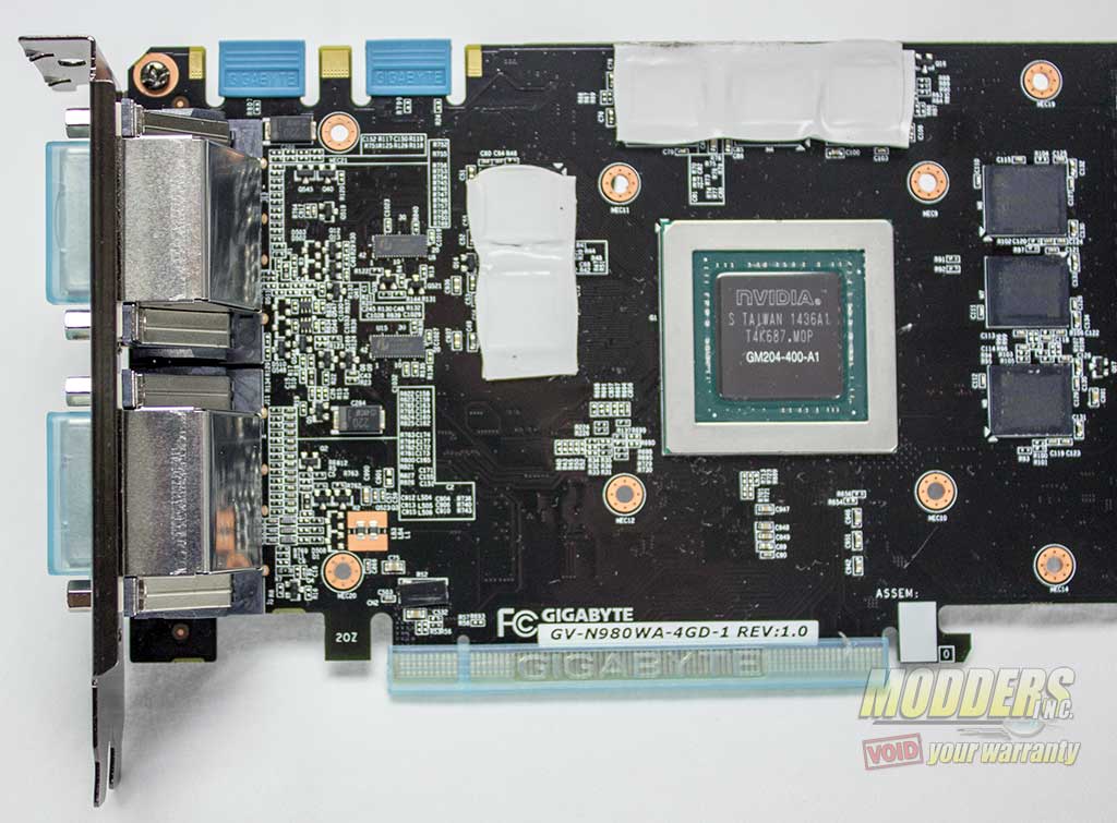 Each card has a pair of ChingisTek Pm25LD010 1Mbit SPI flash for dual redundant BIOS function. As with Gigabyte’s other NVIDIA 900-series video cards, a pair of Pericom PI3WVR 4-lane DP/HDMI switches each capable of up to 5.4Gbps data rate transfers are responsible for the flexible display output capabilities of the Water Force 980.