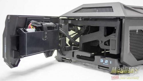 What we see here is where the water cooling radiators call home. A simple, yet smart locking setup is use to keep them in their place. As simple as sliding the radiator in at a small angel, guiding in the pins on the radiator into the slot and pushing it into place takes just a few seconds to complete.