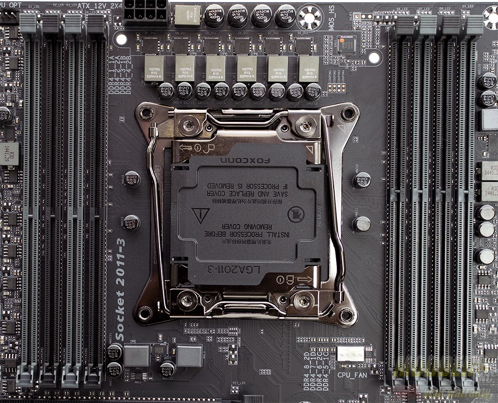 The area around the CPU is uncluttered. There is a bit of space between the CPU socket and the memory modules. For those of you that use air cooling on the X99 platform and depending on your cooler and memory configuration, memory to cpu cooler interference may still occur. The Gaming 5P has eight memory slots available and can support up to 128 Gb of DDR4-3333 RAM.