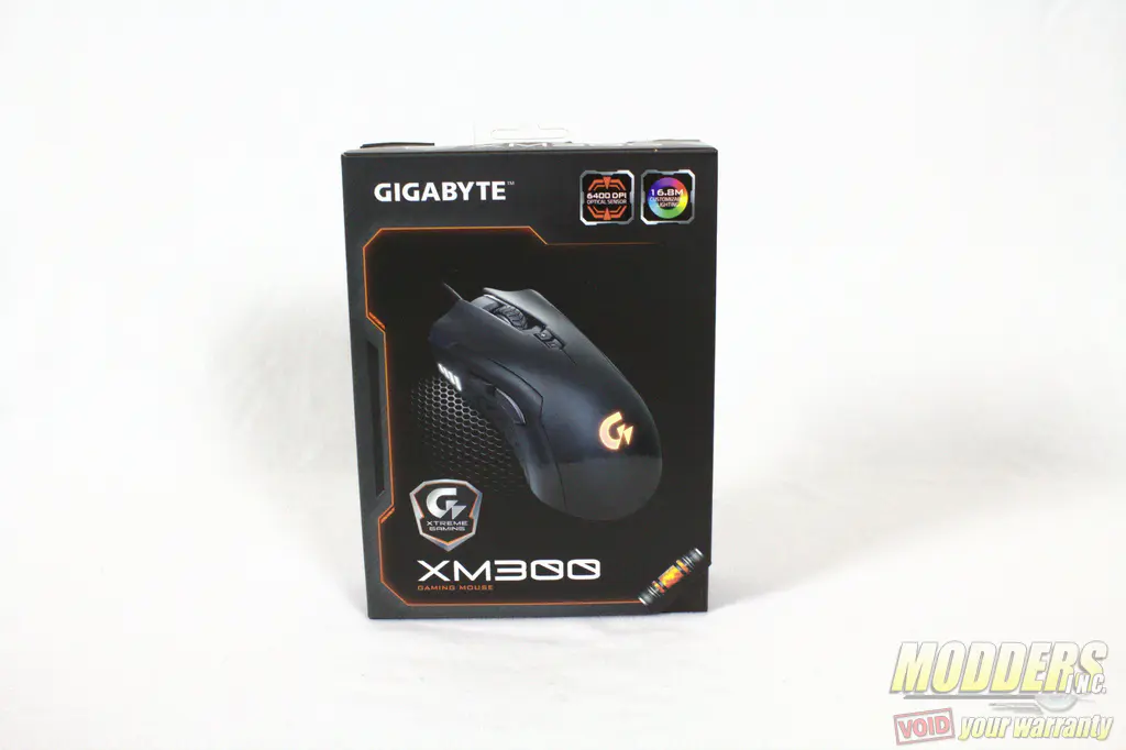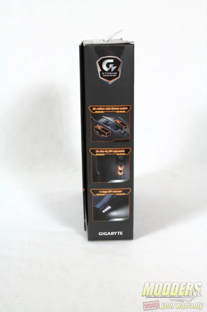The cover of the Gigabyte XM300 when closed advertises the 6400 DPI optical sensor as well as the 16.8 million colors available for the led light. On the left and side of the box, Gigabyte shows their Omron switches, variable DPI controls, and other features. The rear of the box is a breakdown of the specifications and key for each part of Gigabyte XM300.