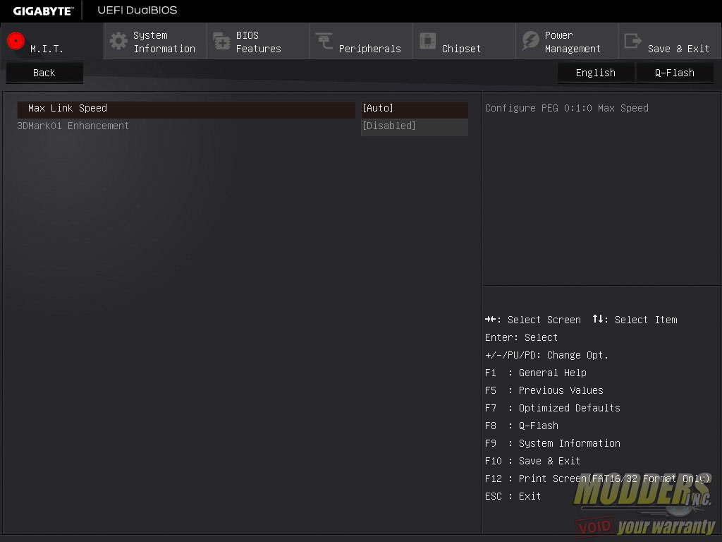 M.I.T.\Miscellaneous Options >: This page only contains two options: Max link speed for PCI-E graphics and 3DMark 01 Enhancement toggle.