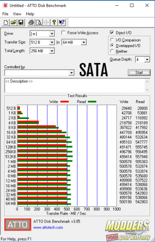 In ATTO, the SanDisk SSD Plus did as expected, nearly saturation the SATA interface. The 850 EVO hit 558 MB/s on the read speeds and about 500 MB/s on the write speeds. On the 960 EVO, its hit 3041 MB/s and 1475MB/s on the write. The NVME results were a bit slower than I had expected from other motherboards I’ve tested the same drive on.