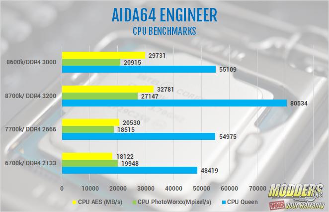 CPU Queen is an integer benchmark that tests branch prediction and misprediction penalties. CPU PhotoWorxx tests the SIMD integer arithmetic execution units of the CPU and the memory subsystem. CPU ZLib is a compression benchmark that tests the combined CPU and memory performance. CPU AES is a multi-core encryption benchmark that uses Advanced Encryption Standard data encryption. CPU Hash is an integer benchmark that measures performance using the SHA1 hashing algorithm. FPU Julia measures single precision FP, FPU Mandel measures double precision FP, FPU Sin Julia measures extended precision FP while FPU VP8 is a video compression test utilizing the FPU Julia fractal module. A quick side note, each processor was tested with different memory, running at different speeds. Since each system was different, it’s not a side by side comparison. As the charts show, the 8600k wasn’t too far behind the 8700k in the Aida64 CPU and FPU benchmarks. In addition, the 8600k was well ahead of both the 6700k and 7700k. Keep in mind, all four processors were on different chipsets and ran different memory.