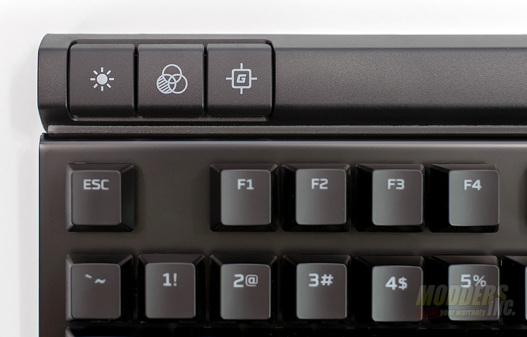 The Alloy Elite RGB features dedicated buttons to manage the different functions and features of the keyboard. At the top left of the keyboard, there are three buttons clustered together. The leftmost key controls the brightness of the RGB LEDs. There are five levels of brightness. The next key manages the profiles stored in the keyboards onboard memory. The last key in the cluster is the Gaming Button, this button disables the Windows key. At the top right of the keyboard, there are four more buttons and a roller. The four buttons are the media keys and the roller is used to control the system volume. The keyboard indicators for Caps Lock, Num Lock, and the Gaming button are located on the far right edge of the keyboard. Notice, while the Scroll Lock key is present on the keyboard, there is no indicator for it.