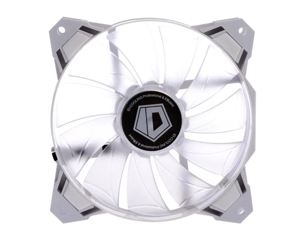 Each ICEKIMO 240W Pure White AIO comes with a pair of ID Cooling’s SF-12025 PWM fans that run at 700 to 1600 RPM (62 CFM max and 1.78mmH20 of static pressure). The blades on the fan are transluscent so the LED’s firing around the frame fill the blades with light during operation. Rubber dampeners are also installed on the corners to absorb vibrations and minimize the noise during operation.