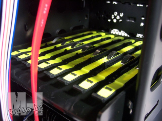Aggressive looks on the case design add a burly, “in your face” attitude to the case. Cavernous interior offers tons of space for lots of hard drives and more than enough room for video cards. Airflow on the case can be manipulated for a variety of installation types. Pre-drilled and grommetedwater cooling holes, as well as back side cooling of the CPU socket are very nice touches. The bulging design aesthetic of the case lends itself well to the extruded panels and the extruded side mesh screens. Extruding the back panel gives additional cable clearances, while the same thing on the meshed fan areas allows for elevated fans not interfering with cable management or hardware (hopefully). A good way ot keeping track of the drive rails so that they are not removed and misplaced: