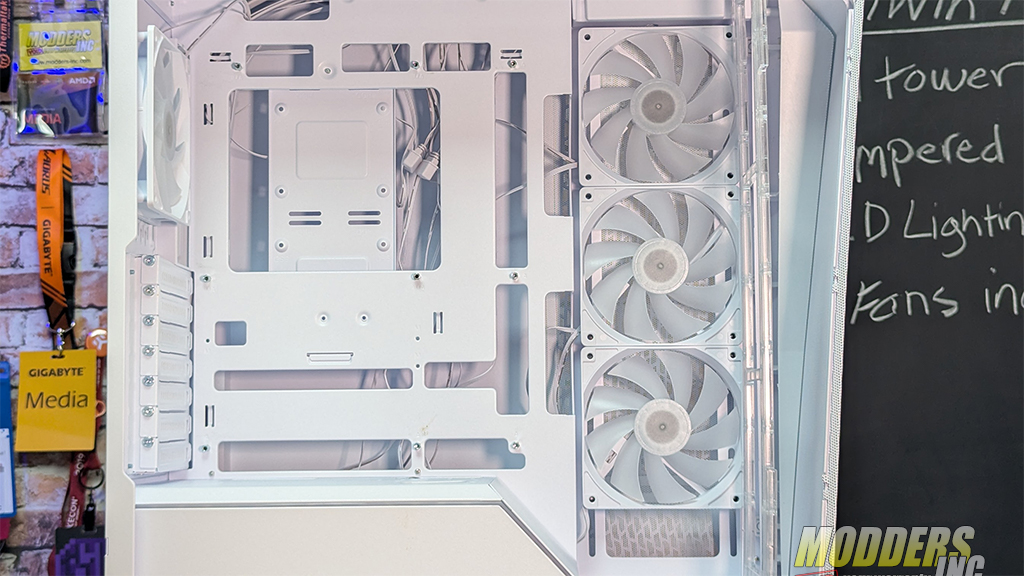 Inside, the Prism is far more practical than its exterior suggests. The layout is open and optimized for clean cable routing, especially if you’re using a BTF/back‑connect motherboard. From the image, we can see all four of the preinstalled 120mm fans. An additional six 120mm fans can be installed without cramping the space of the interior. Listed below are the number of fans and the locations where you install them.
