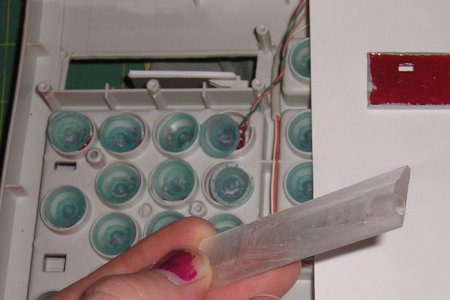 Cutting the lens for the light is pretty straight up. I use 1/4" plexi because it is easy to drill in the LED. The photo shows the shape I cut with a hacksaw. Leaving the plexi rough gave the best light effect. I then cut the hole where the old badge was and the new lens is going to be using a razor knife. Beware of any wires you might have near the cutting area, there was very thin plastic here so I waited until now. If you have more, or are unsure of your cutting, do it before painting. I measured twice, cut small and then trimmed to a tight fit. It is always easier to re-cut rather than try and glue across a big gap.