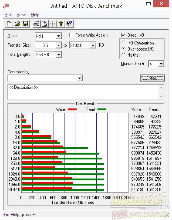 ATTO disk benchmark is a 32-bit compressible data benchmark that measures read and write speeds across various file transfer sizes from 0.5KB to 8192KB to show SSD behavior. Read speeds peaks at 1548666 MB/sec from 512KB and up while peak write speeds peak at 970248 MB/sec.
