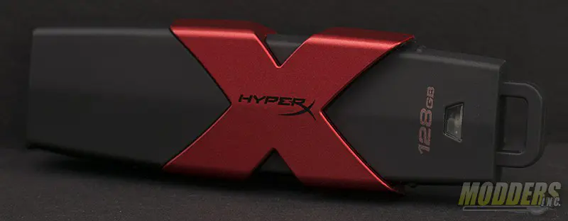 The Kingston HyperX Savage USB drive is stylish with a matte black body with a metallic red X. Storage capacity is listed on each drive near the bottom of the drive. The cap pulls off to gain access to the USB connector.