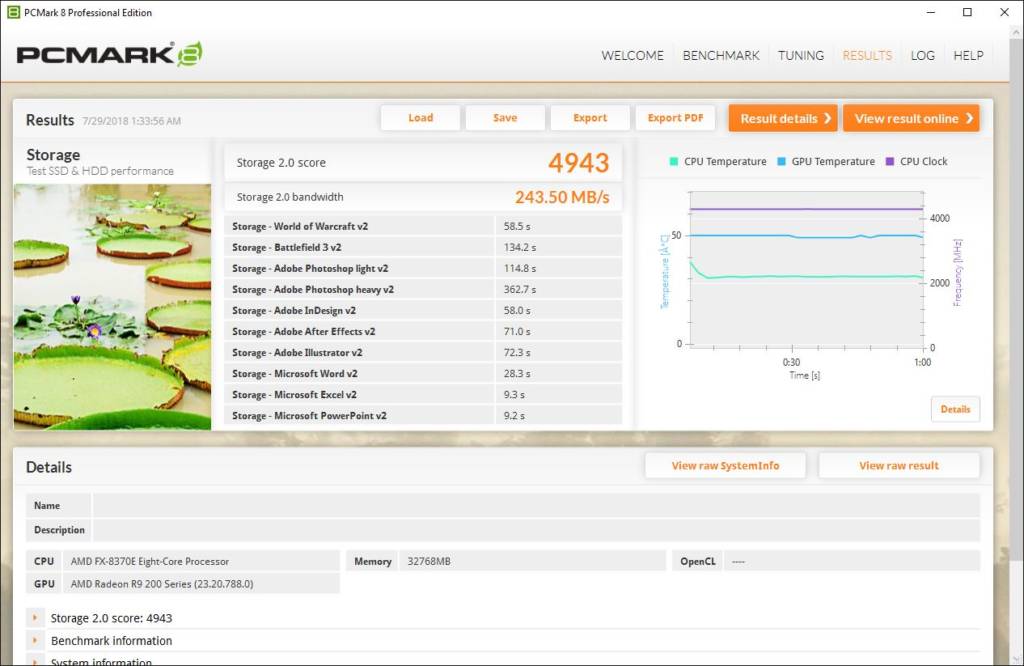 PCMark 8 from Futuremark is a semi-synthetic testing suite that has a specialized Storage testing performance feature. It simulates storage performance while playing games, running productivity and creative programs and generates a total score based on how long each test took and the storage device behavior during its 3-set run.