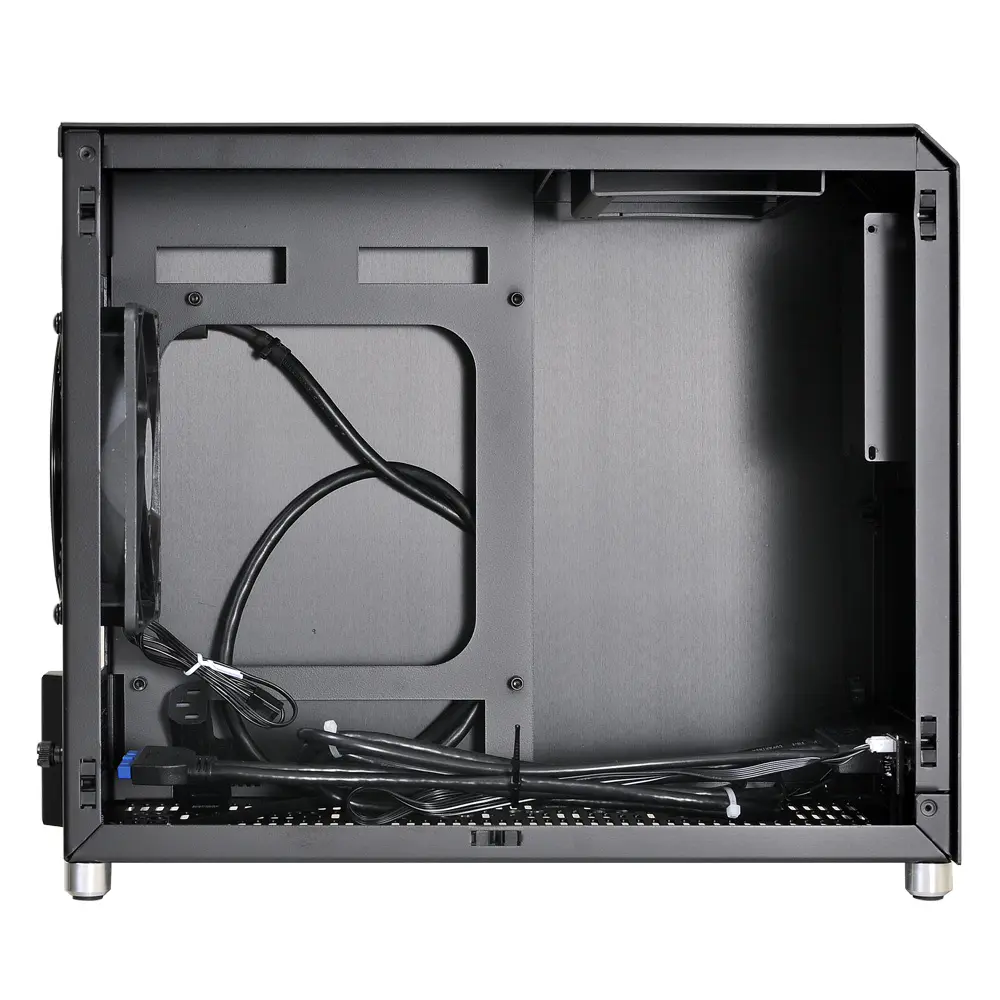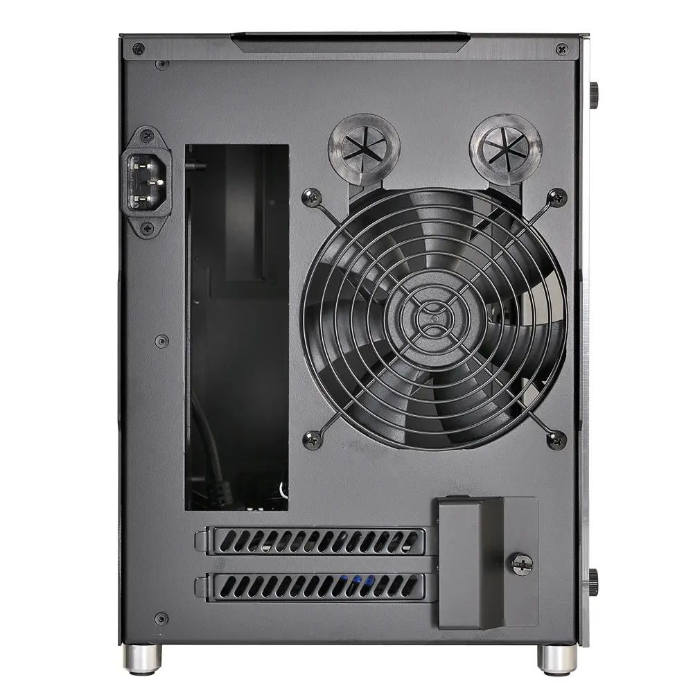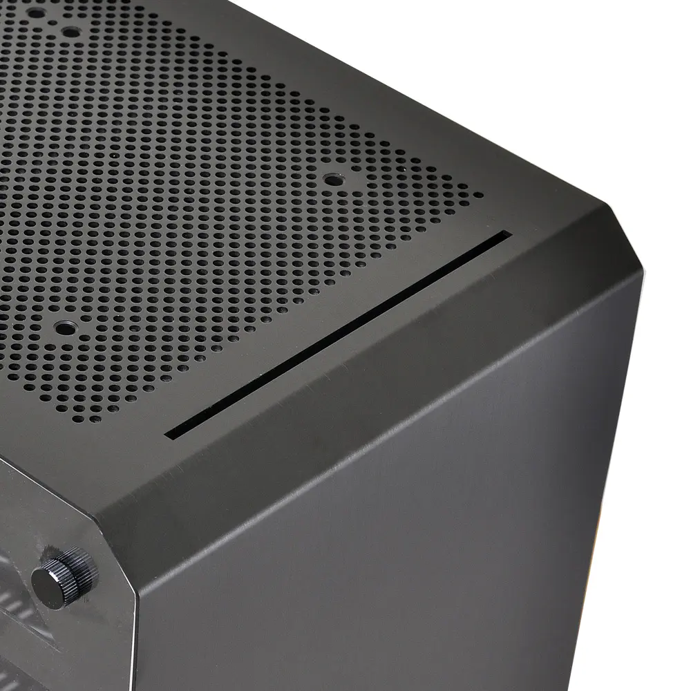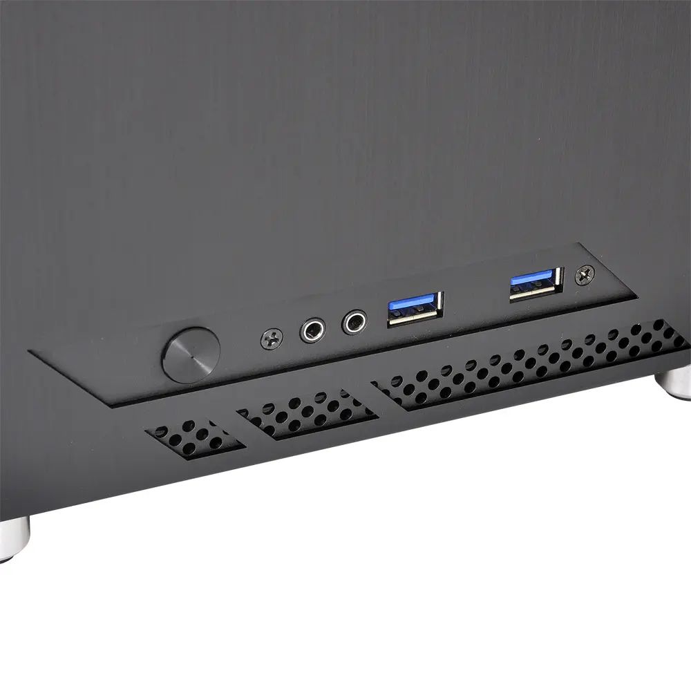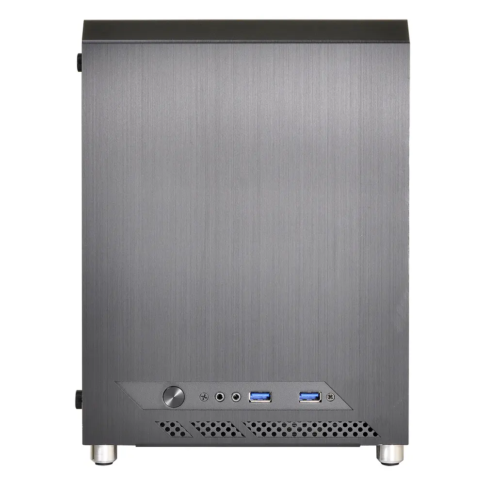 Almost entirely composed of brushed aluminum and acrylic, the PC-Q10WX is robust, beautiful, and minimal. Even its power button is cut from aluminum. Aluminum pegs with rubberized feet provide clearance along the bottom panel for increased airflow. The power button, two USB 3.0 ports, and HD audio ports are available on the front panel, along with a small air vent, for convenient connectivity. The top and side panels pop open and closed securely while the glass wall uses 4 thumbscrews for easy access.