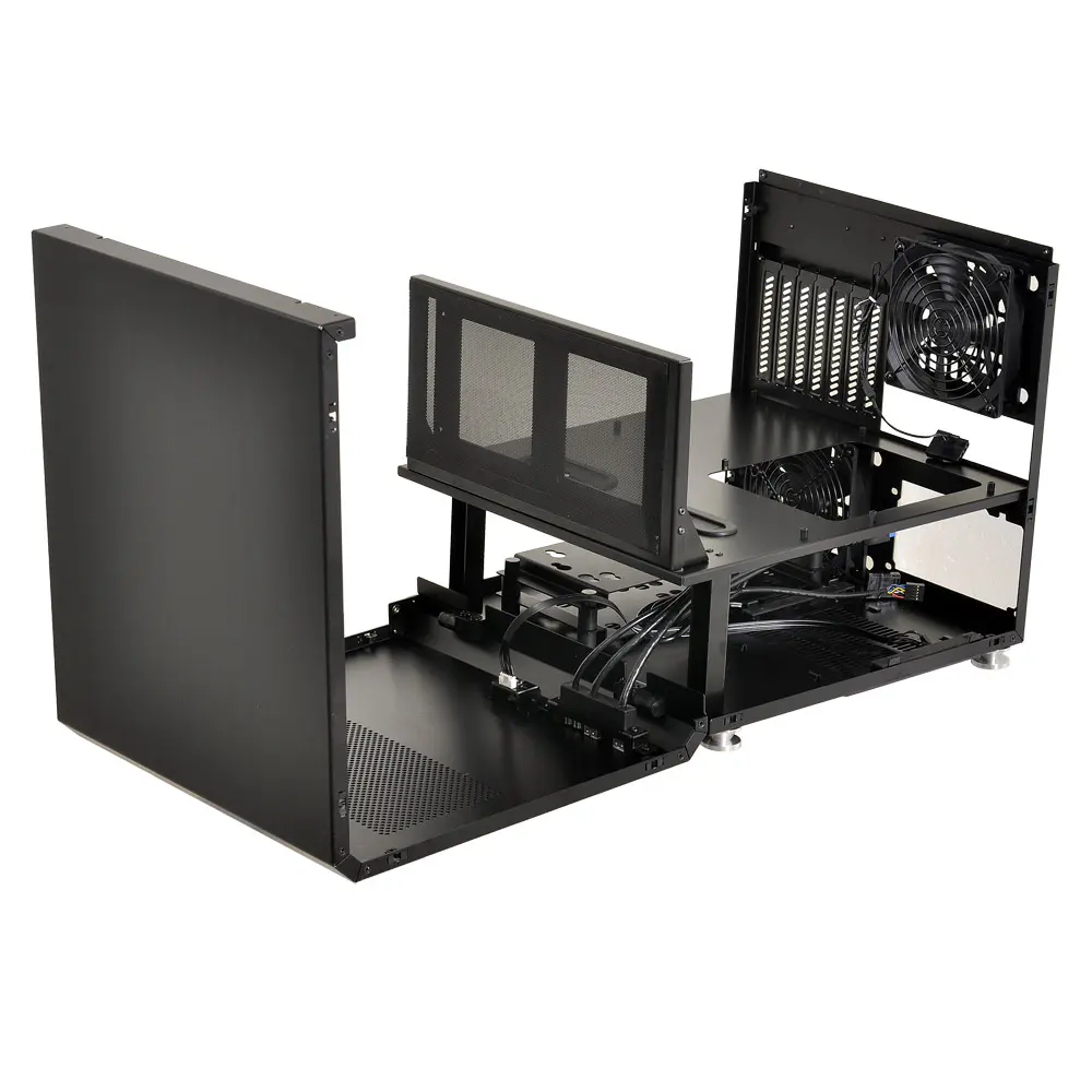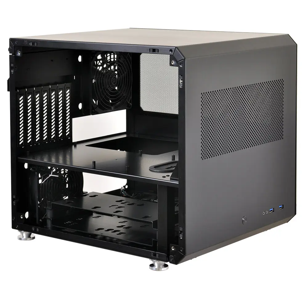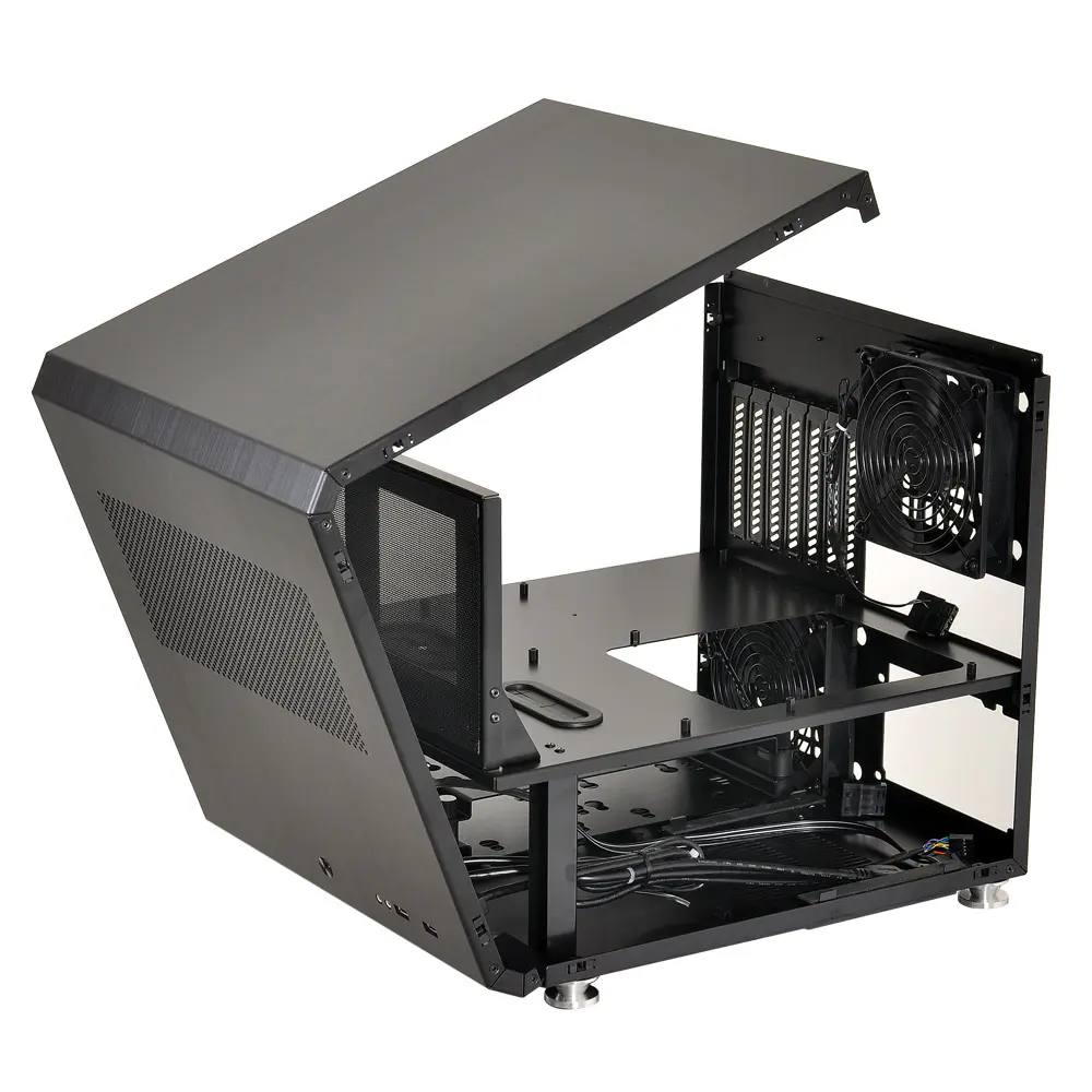 The newly designed illuminated power button is now made out of the same high grade brushed aluminum as the whole case. The pop-out side doors detach and reattach effortlessly, yet remain firmly in place. The front and top panels form a canopy as a single fold of aluminum, adding strength and beauty to the cube case. When hinged open, the case internals become accessible in the same manner as a test bench, allowing system builders to install the components and change them with ease without any walls in the way. Dual 120mm case fans or up to a 240mm water cooling radiator can fit internally on the front bracket that also holds the magnetically attached air intake filter.