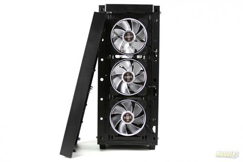 The air is being pulled from the front of the case trough small holes. The main source of the air is being generated by three 120mm fans. These are RED LED fans that give accent to the entire case when lit. These fans have standard curved blades.