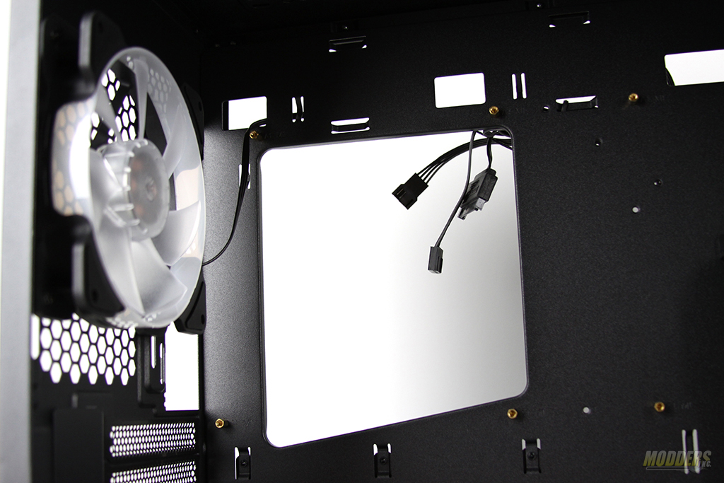 The overall structure of 5PM is very solid. The case itself is made from steel sheet and double riveted where support is most needed (corners). The bottom portion of the case is reserved for the power supply. I really like the hidden power supply cases as they make the case appear neater. For cable management 5PM has a plastic cover in the middle of the case that keeps cables hidden from the naked eye. The fan controller as I have mentioned earlier is mounted on the back of the motherboard tray. The motherboard tray is non-removable and has an odd shape of a CPU maintenance window.
