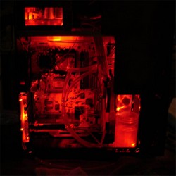 It was then time to swap in a new board and processor configuration. The only bad thing about doing this was the fact that I could find the damn clip for the water block :(. The entire time I was playing off of this Sapphire Pure Innovation board for its white color with red accents. So after checking around to see if any friends had a spare CPU cooler (not enough time to order one before I left) that they could bring in case my quick fix doesn’t hold for the trip. I whipped up a small plexi plate and shimmed it up with some double sided tape :D. Not the best solution, but it held for the trip there and back with no problems.
