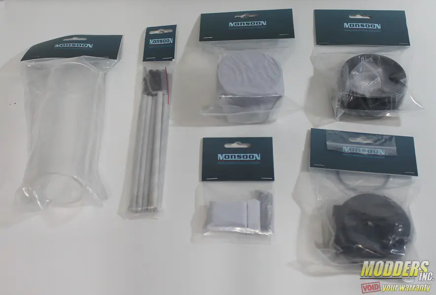 Each piece come individually packaged in a plastic bag with a cardboard tag that has the Monsoon logo on the front and the part # on the back.