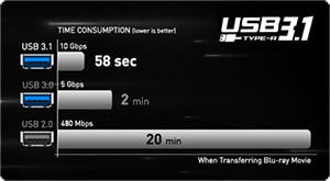 USB 3.1 allows for speeds up to 10 Gbps, doubling the speed compared to USB 3.0 and 20x faster than legacy USB 2.0. USB 3.1 is even faster than SATAIII! Transferring your favorite games, albums and movies over USB has never been faster.