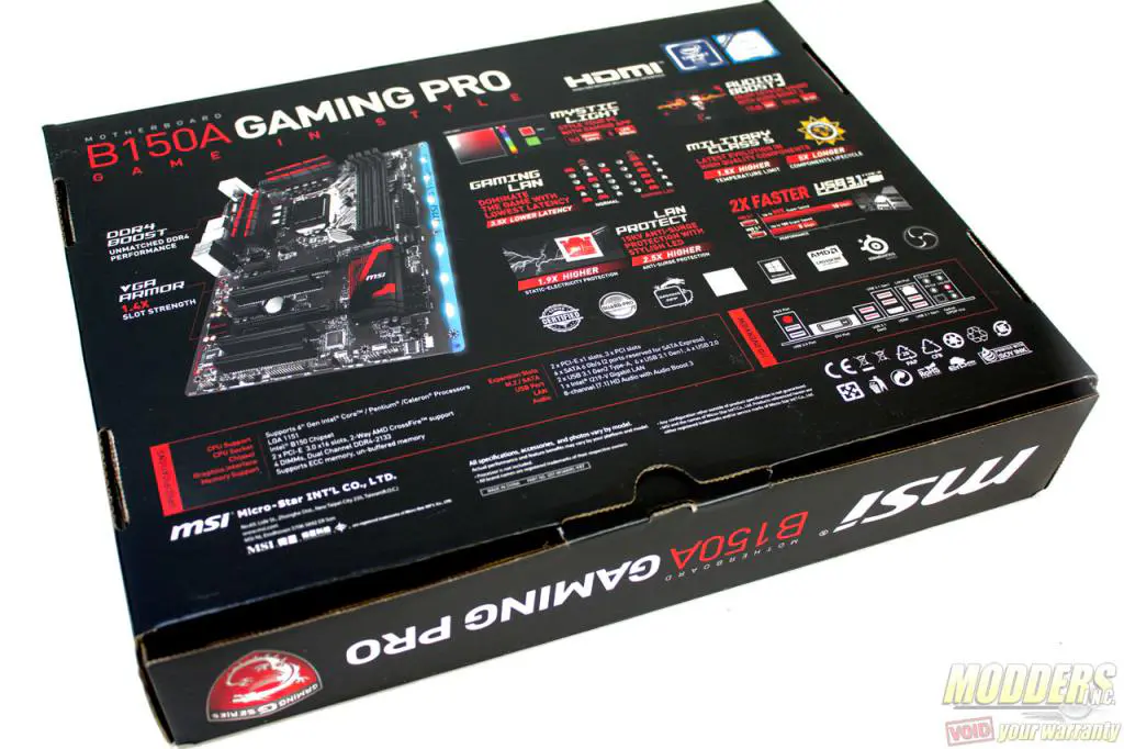 [sc:sponsor sponsor=”MSI” product_link=”http://www.msi.com/product/mb/B150A-GAMING-PRO.html” product_name=”MSI B150A Gaming PRO Motherboard” product_price_link=”http://amzn.to/1LEFaxm” product_price=”$119.99″ ]Other than the labeling, the packaging is similar in to MSI’s Z170 mainboards with no cost-cutting measure levied here.