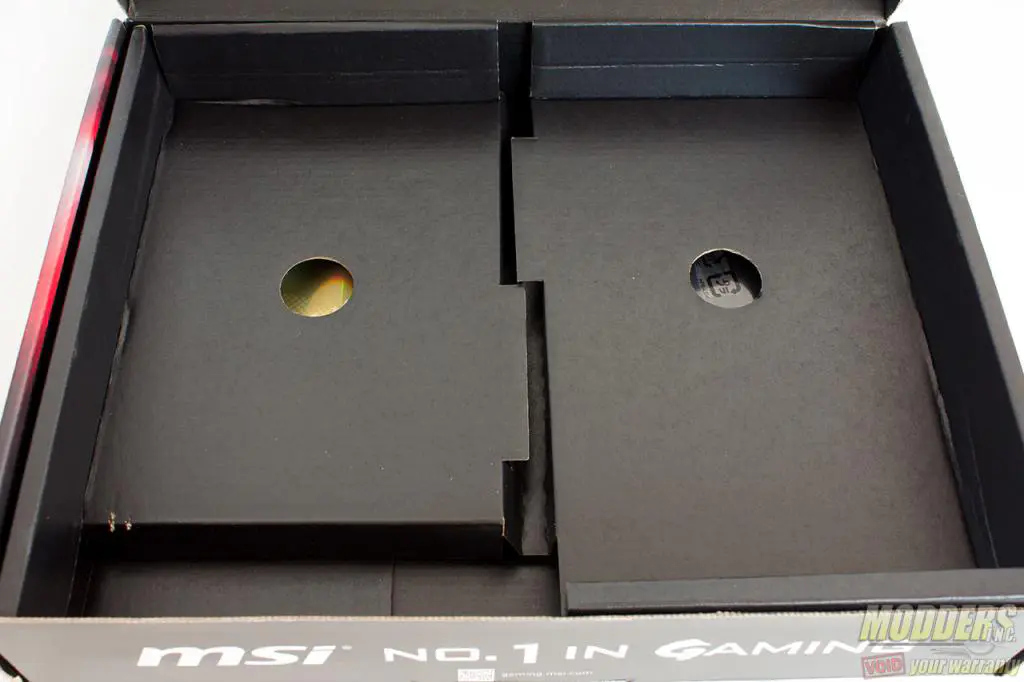 The top compartment houses the motherboard in an anti-static bag and cradled in anti-static foam sheet padding. The lower compartment houses the accessories.