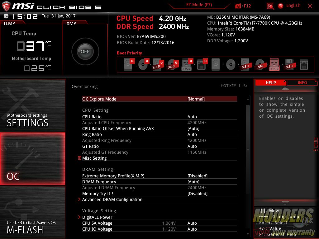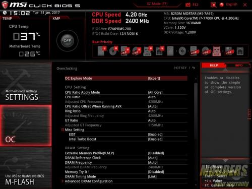 Since it is a B250 chipset, overclocking is locked down even if you have an unlocked processor. The OC section is where those settings normally are adjusted but on the B250M Mortar, it will only allow users to adjust some settings such as down clocking from stock or adjusting voltage as well as changing CPU settings.